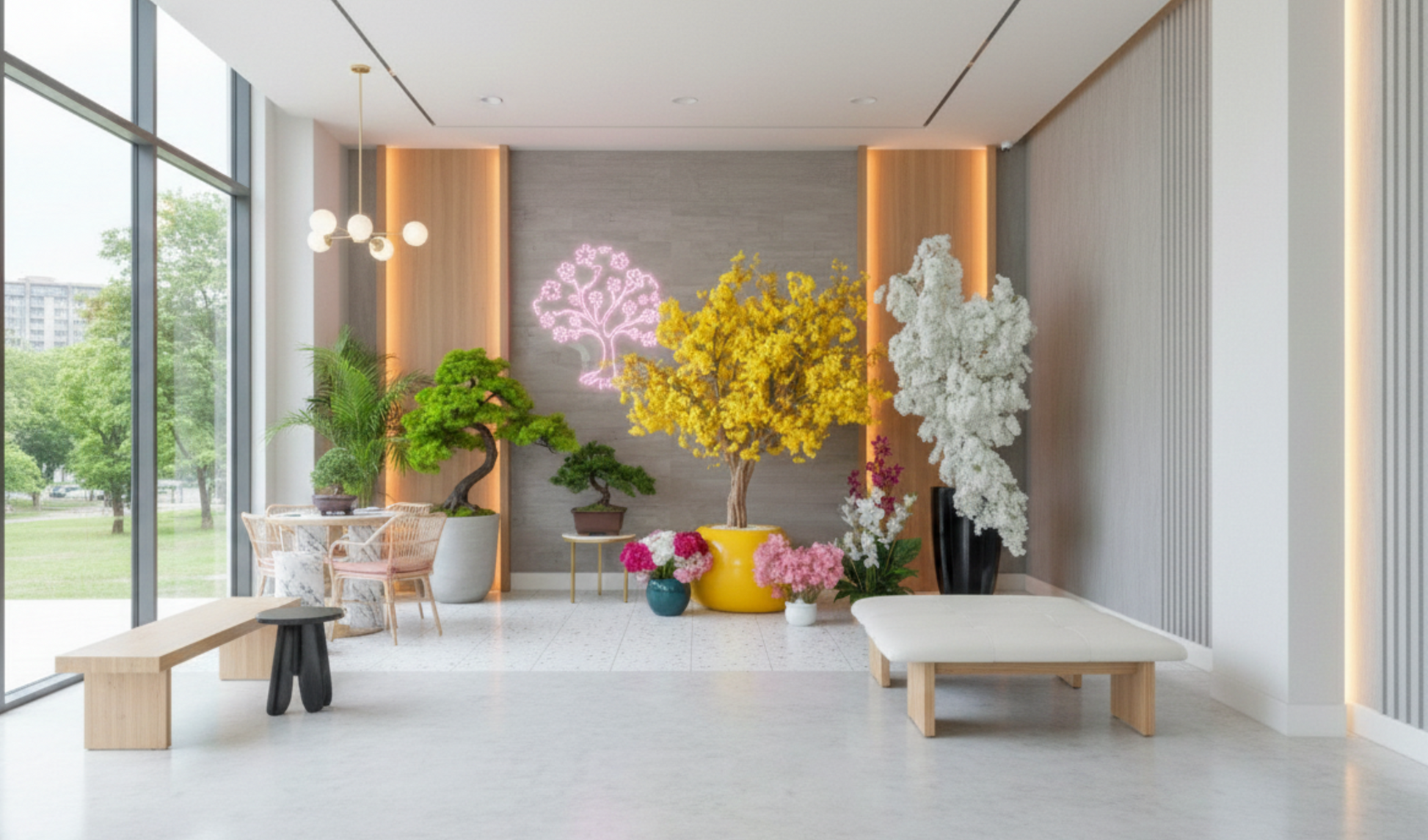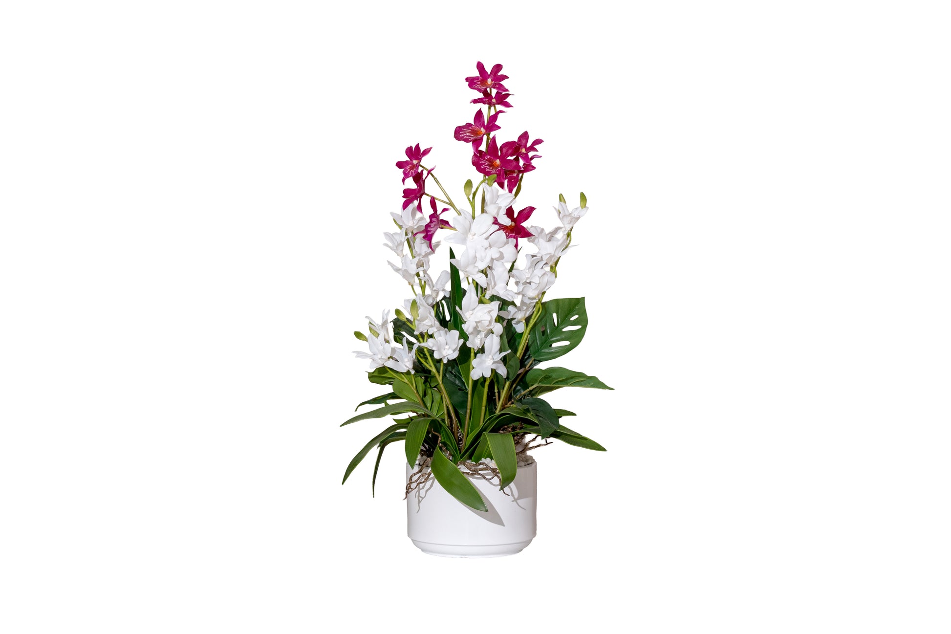 A dual-tone orchid arrangement with white and fuchsia blooms in a minimalist white pot, perfect for dining tables, consoles, or office reception desks.