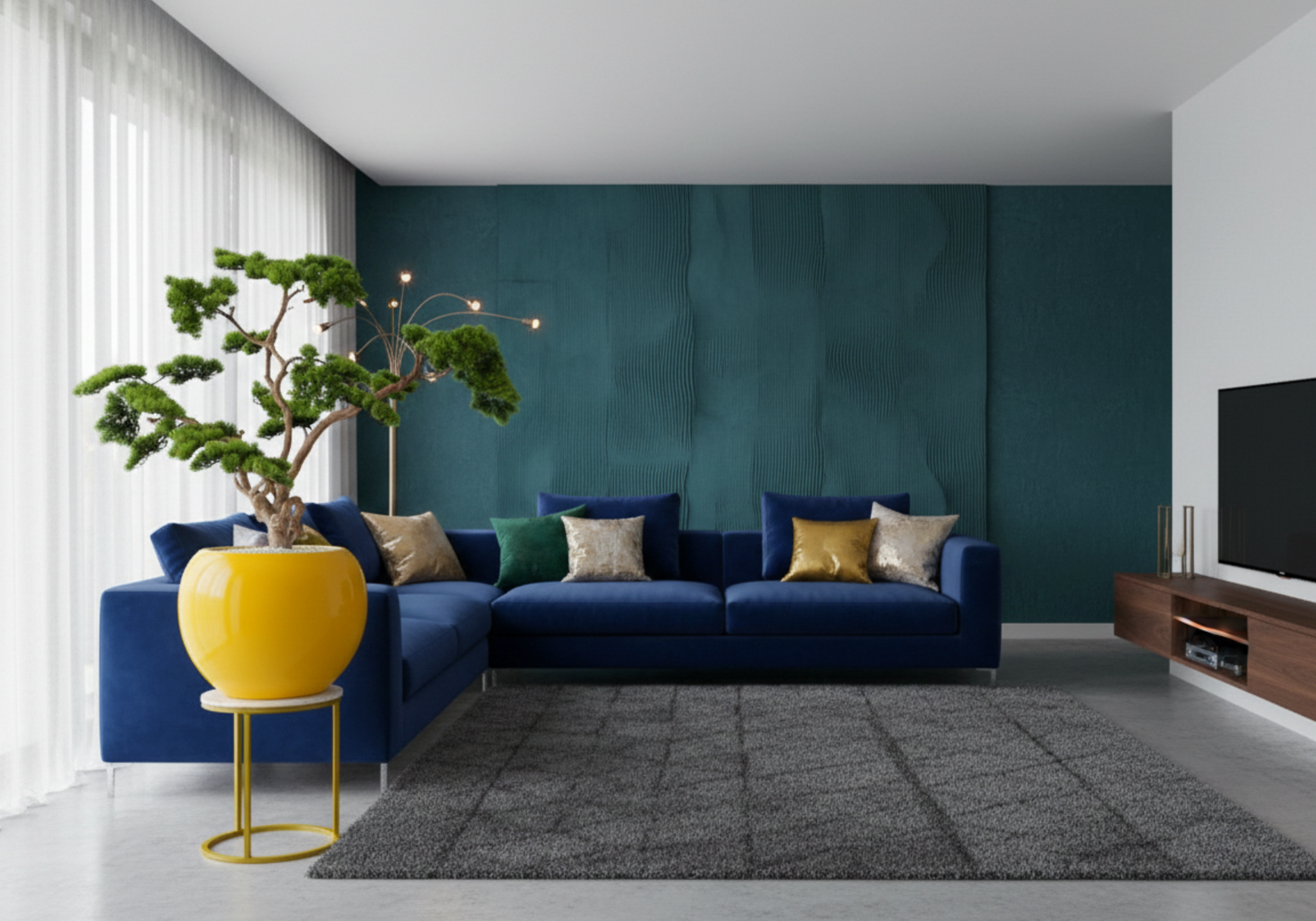 A statement bonsai-style decorative tree with sculpted greenery in a bold golden orb planter. Designed to bring a modern touch of nature to living rooms, lobbies, and entryways.