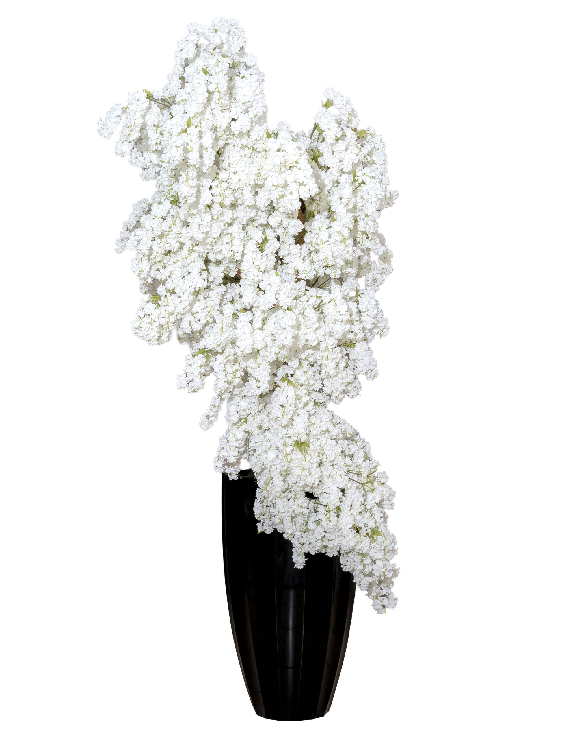 An extra-tall white floral installation that flows like a waterfall from a sleek black vase – designed to transform staircases, corners, and double-height spaces.