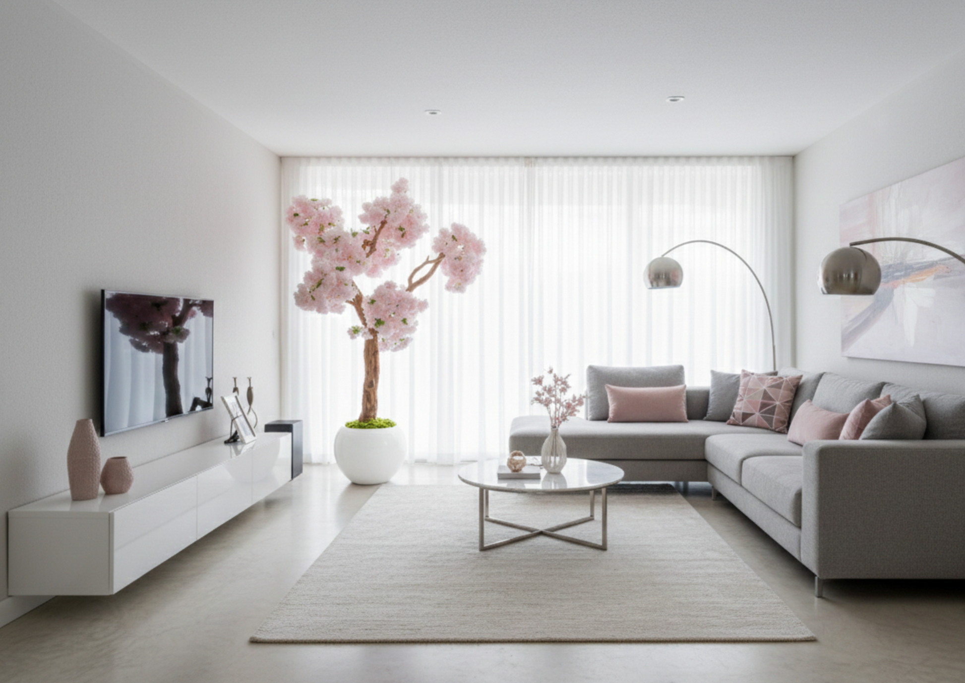 A sculptural pink cherry blossom tree with soft cloud-like blooms, created to be the focal point in living rooms, boutiques, or reception areas.